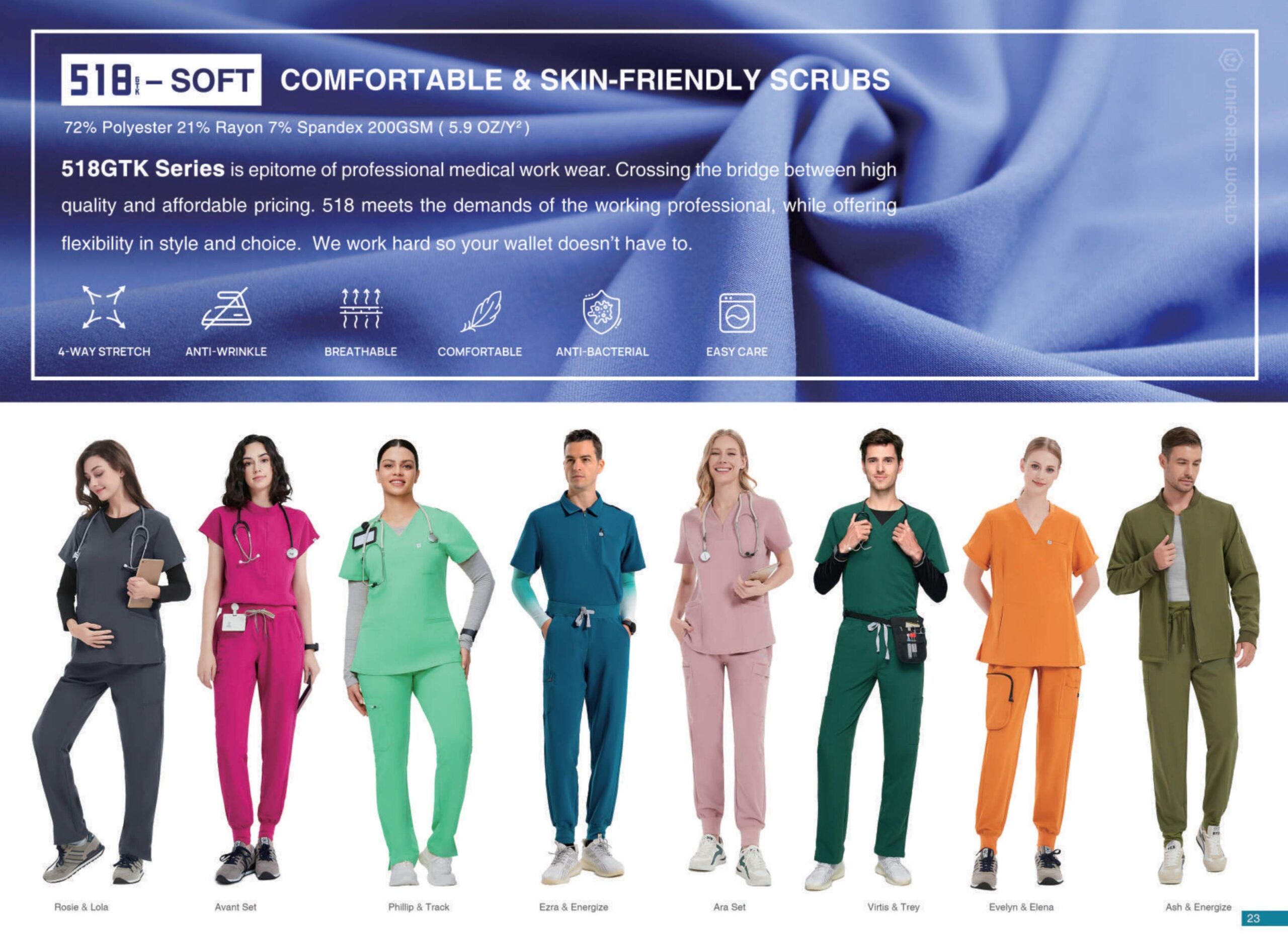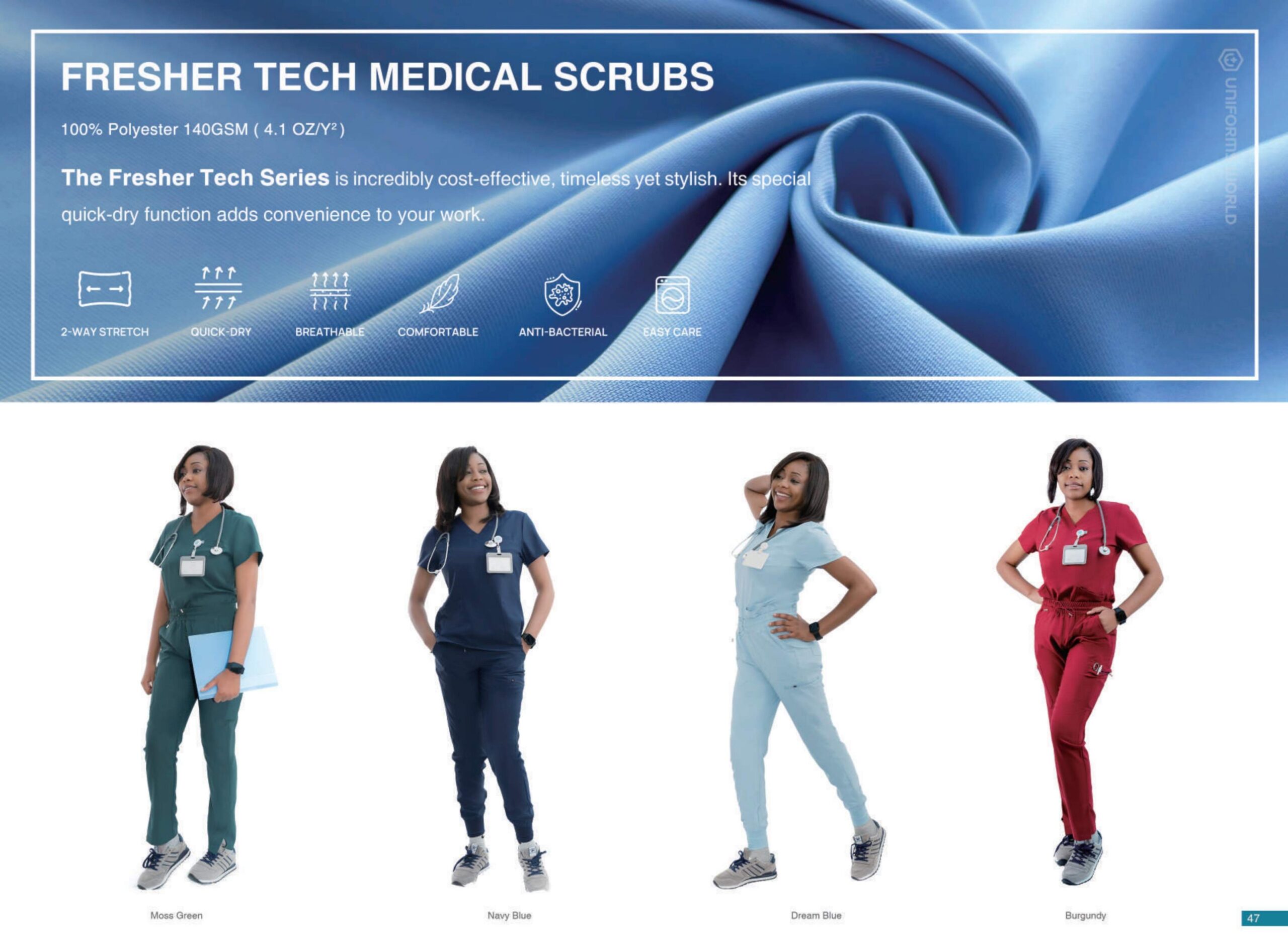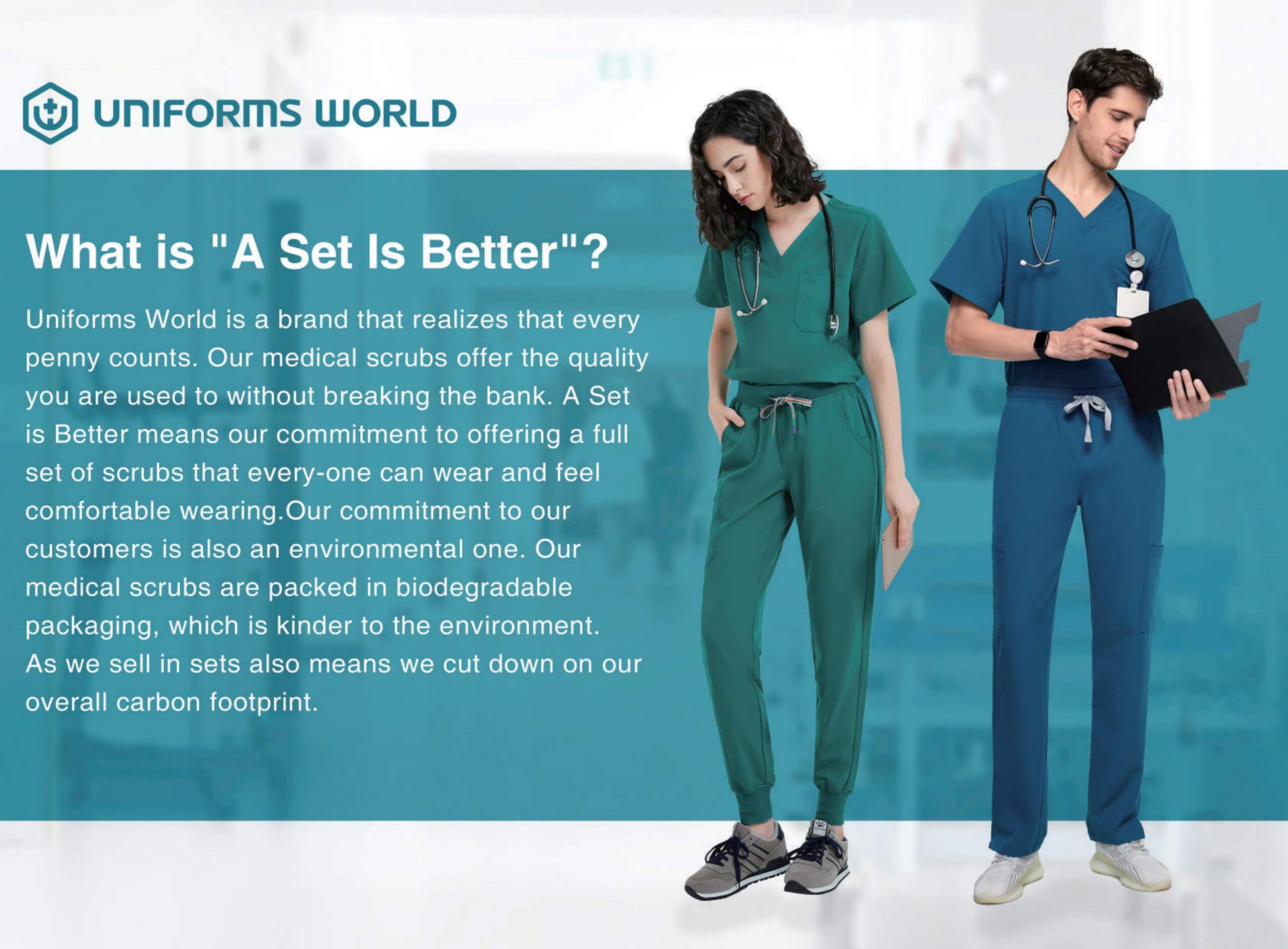 Uniforms World is a brand that realizes that every penny counts. Our medical scrubs offer the quality you are used to without breaking the bank.A Set is Better means our commitment to offering a full set of scrubs that every-one can wear and feel comfortable wearing.Our commitment to our customers is also an environmental one. Our medical scrubs are packed in biodegradable packaging, which is kinder to the environment. As we sell in sets also means we cut down on our overall carbon footprint.