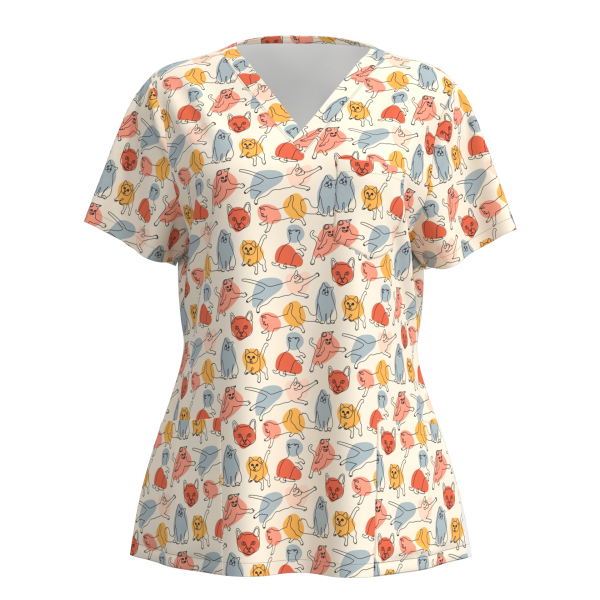 Furthermore, we offer OEM and ODM services, allowing our clients to customize their uniforms according to their specific requirements. Our experienced team works closely with customers to understand their needs and create personalized designs. So that we can deliver large orders promptly with our efficient supply chain, ensuring that healthcare facilities get the necessary Printed Scrub Tops On Sale.